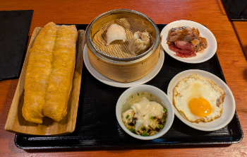 トレイででてくるCセットの料理は、1個ずつで、一見ちょっとさびしかったけれど、蒸し餃子、シウマイがあり、それぞれ一口で食べちゃうけれど蒸したてのようで美味しい。揚げパン(油条)が、トレイ左にドンとのっている。お店の人に「どうやって食べるの?味は付いている?」と尋ねると、味は付いていない。そのままか、豆乳に浸して、と教えてもらう。