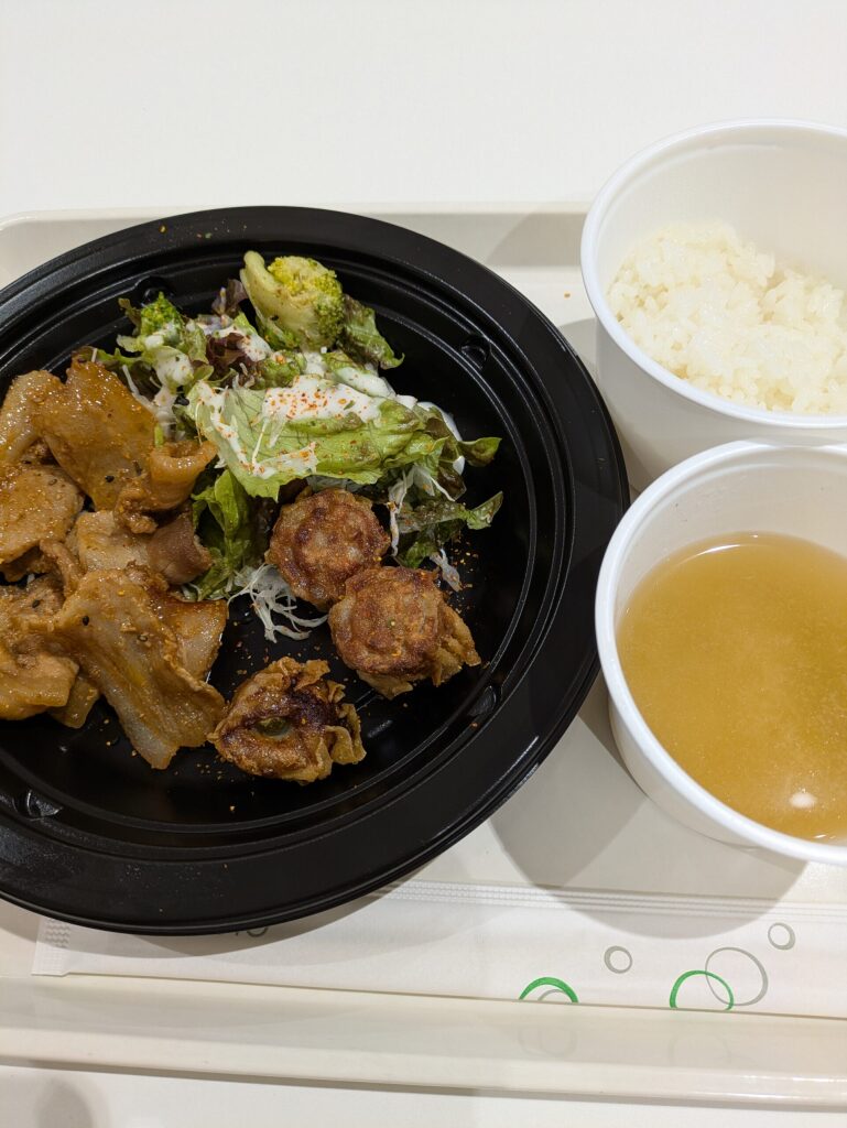 今回いただいたのは、豚肉焼き肉と春巻きのセット。ただし、春巻きがなくなってしまったとのことで、揚げシュウマイが代わりとなっていた。食器は、料理、ご飯、味噌汁ともにテイクアウトにもそのまま使われるようなプラスチックのもので、レストランや食堂っぽくはないけれど、値段と場所を考えればこれで十分。