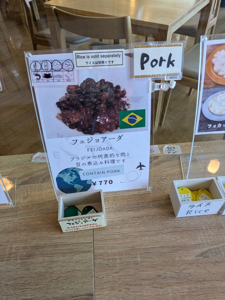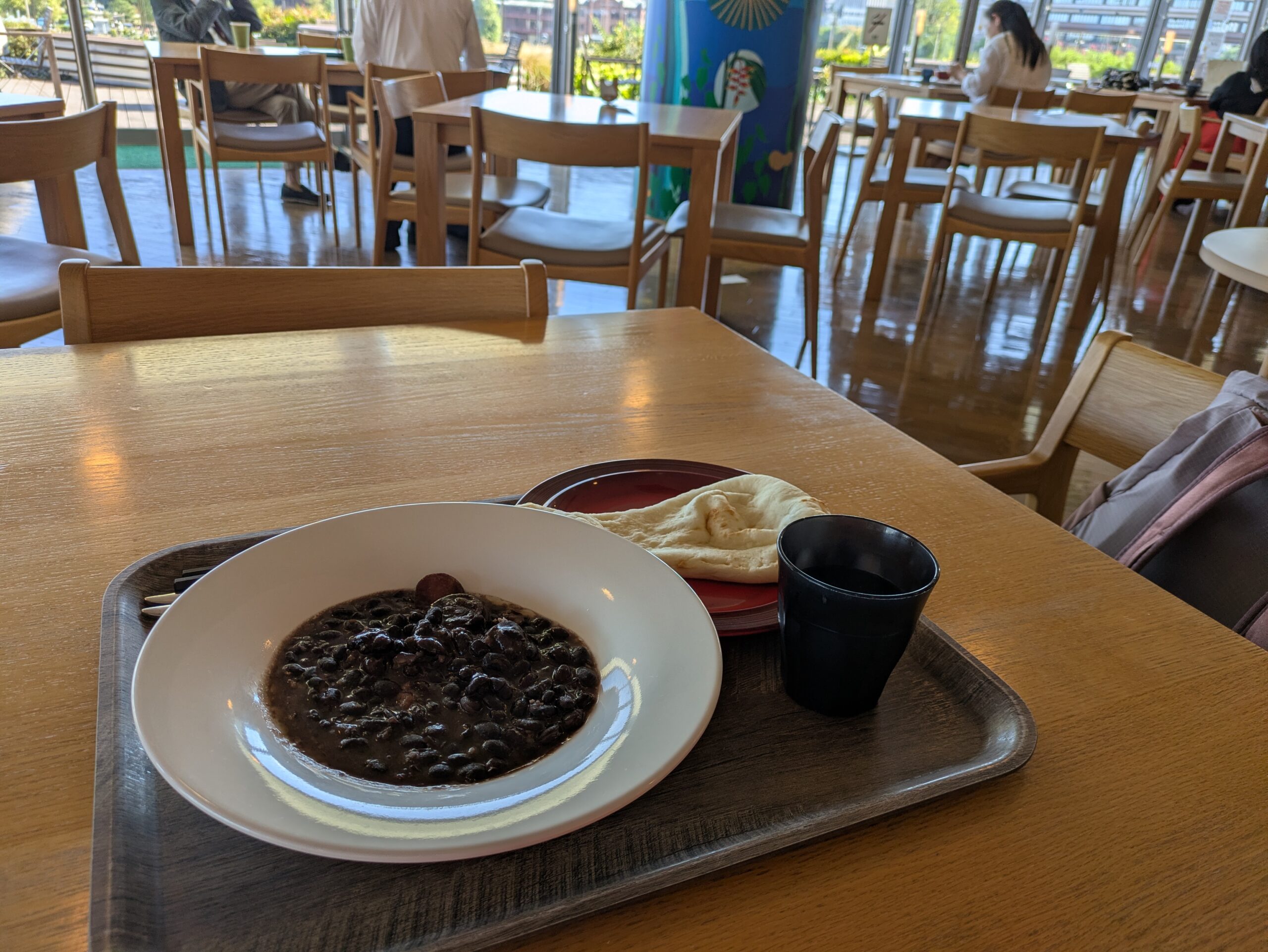 私が食べたのは、フェジョアーダ。ブラジルの豆と肉の煮たものをご飯を組み合わせた素朴な料理だ。選択肢としては、そのほかにも東南アジア的エスニックなものなどがあったけれど、売り切れだった。入り口に料理の写真と、プラの札があって、フェイジョアーダの札をとって、カフェ内のカウンターにいってお金を払う。