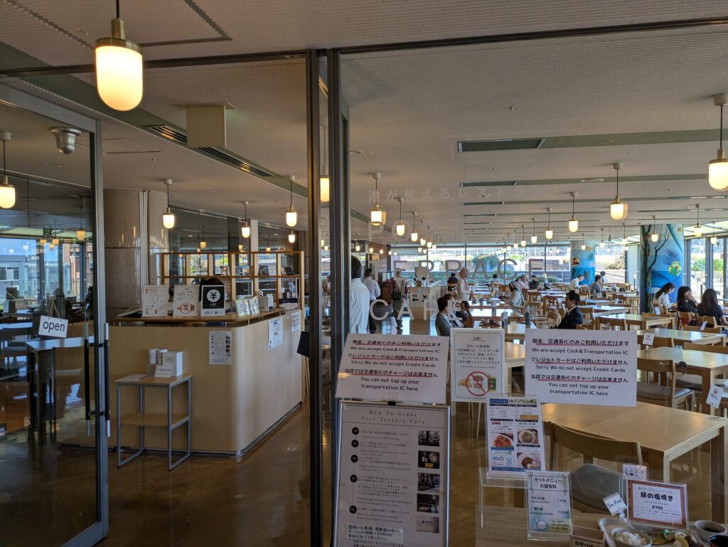 カフェは広々としていて、テラス席もあるが風が強かったので室内でいただいた。窓からは、大桟橋に停泊している大型客船の姿も見えた。価格も、付近のカフェに比べると少しお手軽。ランチタイムは、けっこう混んでいたが、時間帯を外すと少し空いてくる(その代わり、売り切れメニューが増えてくる)