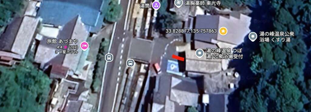 つぼ湯の順番待ちは、「湯の峰温泉・公衆浴場」の前に並ぶ。(Googleマップのストリートビューの写真は、25年秋に見た限り、少し古い。現在は公衆浴場はリニューアルされ建物がきれいになっている)