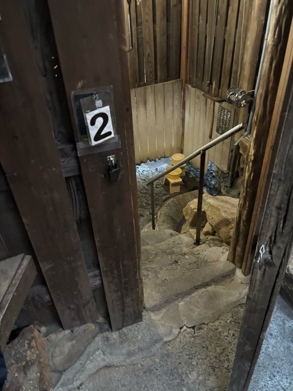 旅館などが並ぶ川岸に、順番待ちの人がいられる場所があり、そこから階段で降りていく。つぼ湯の小屋の前に、囲われていないが靴を脱いだり荷物を置けるベンチみたいな場所がある。靴はそこで脱ぐことになる。貴重品以外は、このベンチみたいな場所に置いていく。雨が降っていると、ここに置いたものは、濡れちゃいそうだ。小屋の扉を開けると、そこからまた少し階段で降りて、湯船と洗い場のある「つぼ湯」がある。